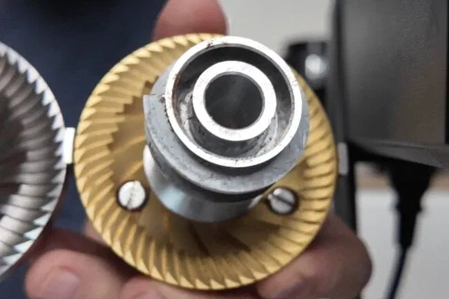 At first, they seemed almost identical in size to the stock burrs, but they’re actually just a smidge larger. That small difference means you need to file the rotating carrier to get them to fit properly—both on the outher edge, around the two pins, and on the inside as well.